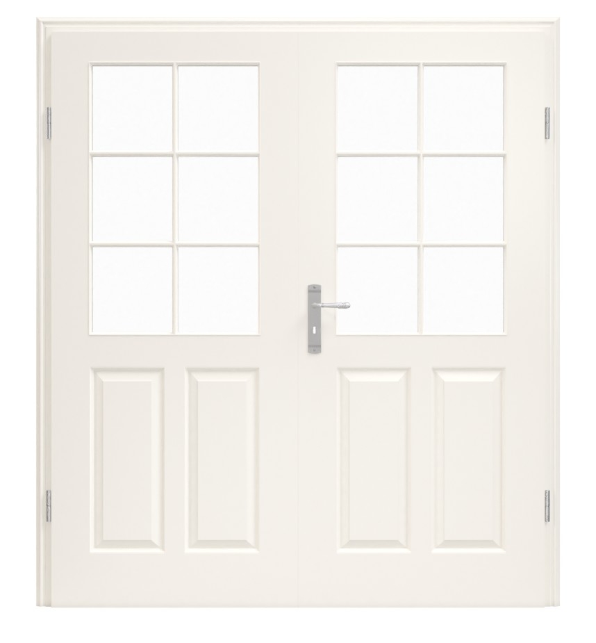 Ponadczasowy urok: wysokiej jakości biała lakierowana podwójna drzwi serii Stiba Plus od Jeld-Wen (w kolorze podobnym do RAL 9010 lub RAL 9016) kształtuje atmosferę Twojej nieruchomości.