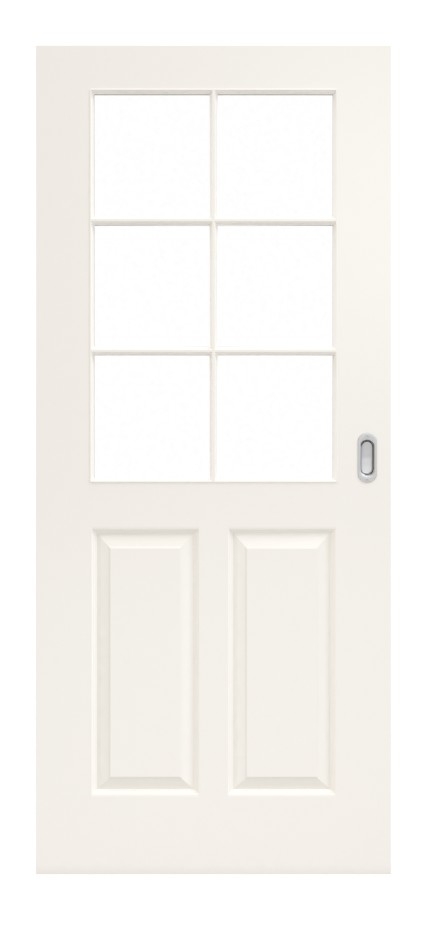 Dwie drewniane kasety w dolnej części skrzydła drzwi są uzupełnione przez górny, duży szklany otwór. Na szkle znajduje się wąski ramka z przegrodami, która wizualnie dzieli całość na sześć części.