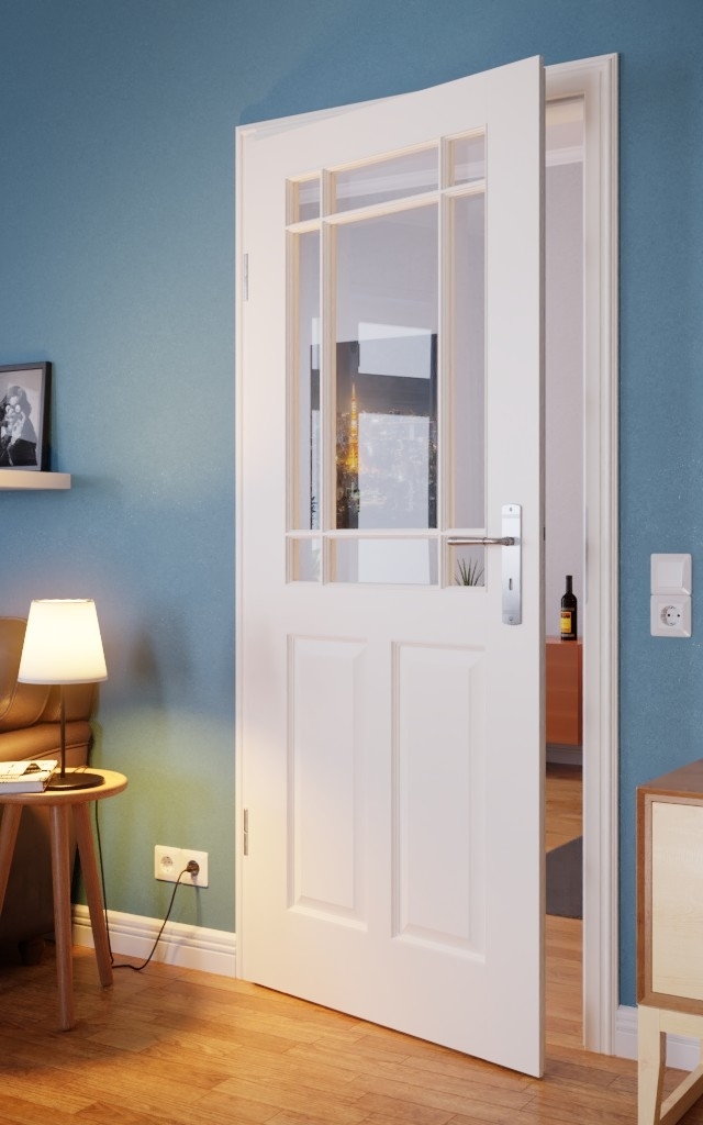 Wykonane z pełnego rdzenia, który zapewnia odpowiednie wsparcie, szczególnie charakterystyczne jest wysokiej jakości białe lakierowanie. Harmonijna gra bieli i światła obiecuje przestronny szklany wstaw z nałożonymi listwami szklanymi, który jest szczególnie podkreślony przez leżące drewniane szprosy. Formowana okładzina autentycznie imituje tradycyjną konstrukcję ramową.