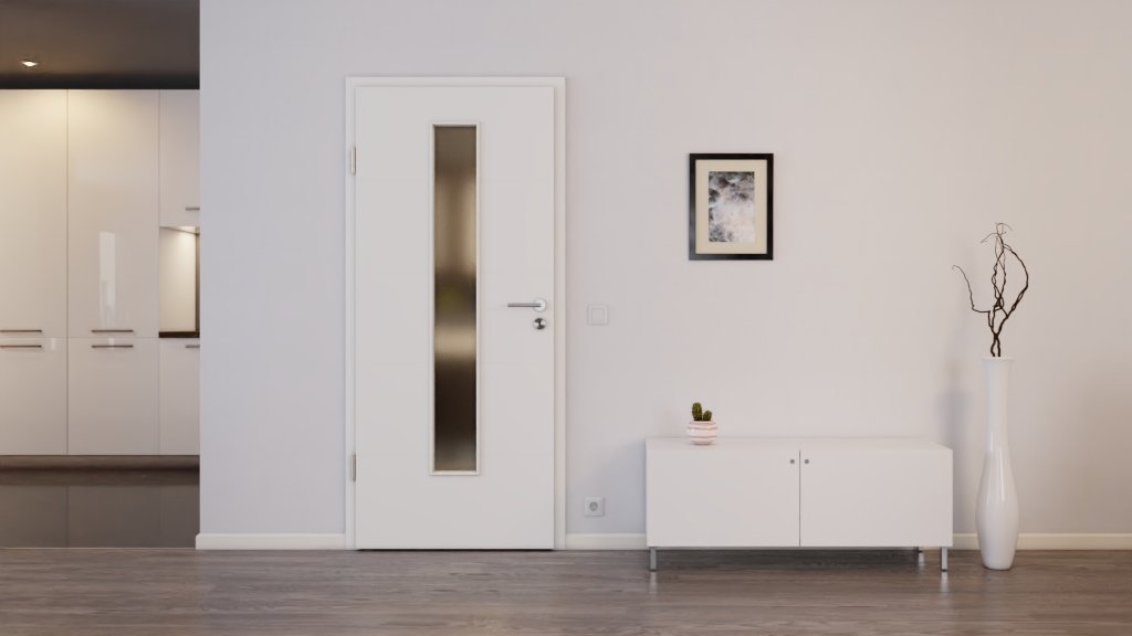 Frezowania rowkowe są zintegrowane w skrzydle drzwiowym. Dodatkowo znajduje się centrowane, wąskie okno, które wpuszcza światło do pomieszczenia. Biała powierzchnia podkreśla elegancki wygląd.