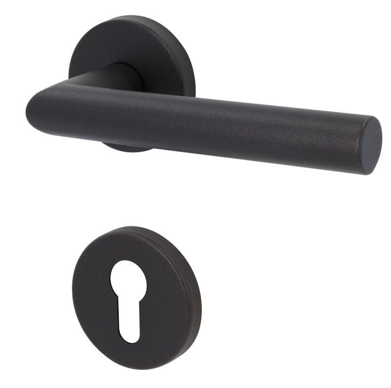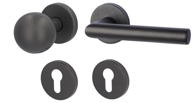 Delikatnie strukturalna powierzchnia oraz cylindryczny kształt klamki zapewniają przyjemne użytkowanie i dotyk. Dzięki unikalnej wyglądzie czarnego stali okrągły zamek subtelnie łapie światło, podczas gdy okrągłe rosety doskonale podkreślają klasyczny wygląd