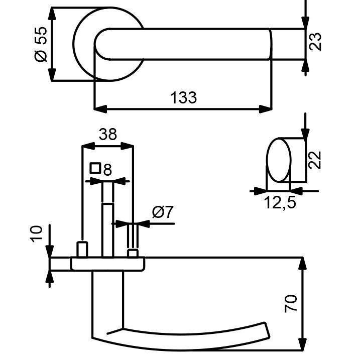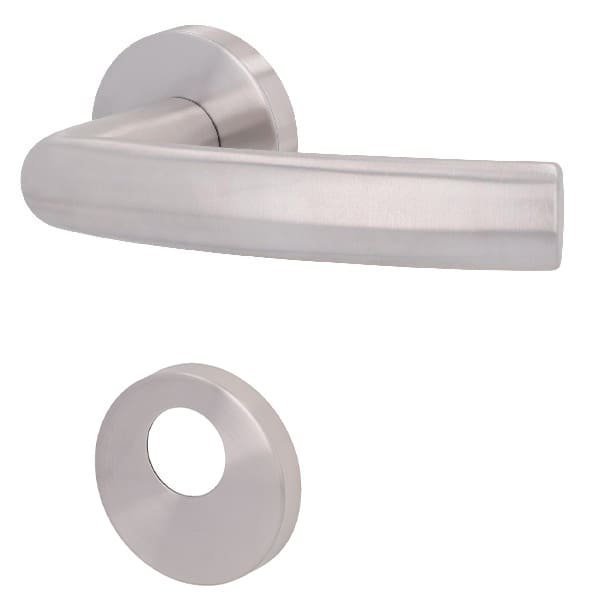 Matowa, satynowana powierzchnia ze stali nierdzewnej redukuje odciski palców i zapewnia elegancki, zadbany wygląd. Lekko wygięty do przodu uchwyt na okrągłych rozetach nadaje stylowy akcent i oferuje przyjemne wrażenia dotykowe. Zintegrowana sprężyna podtrzymująca gwarantuje precyzyjne, poziome położenie klamki, nawet przy częstym użytkowaniu.