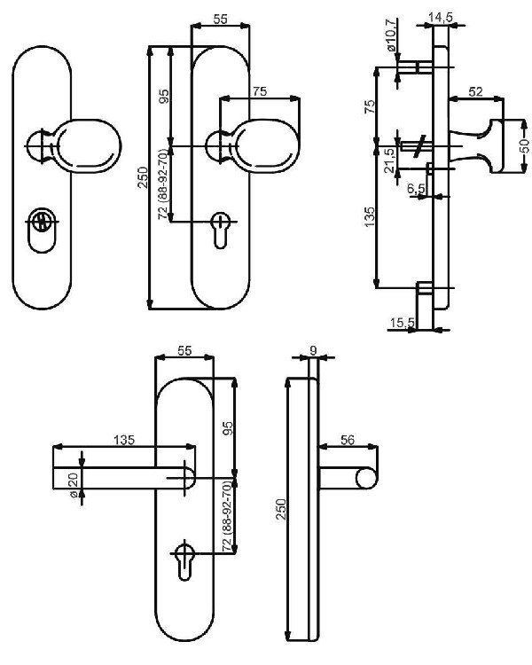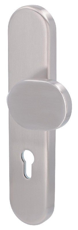 Szczotkowana stal nierdzewna nadaje modelowi delikatny połysk i emanuje nowoczesną, chłodną elegancją. Szyld jest wewnątrz wyposażony w klamkę w kształcie litery L, a na zewnątrz w zaokrągloną płytkę uchwytu. Obustronnie zaokrąglony szyld elegancko komponuje się z drzwiami wejściowymi.