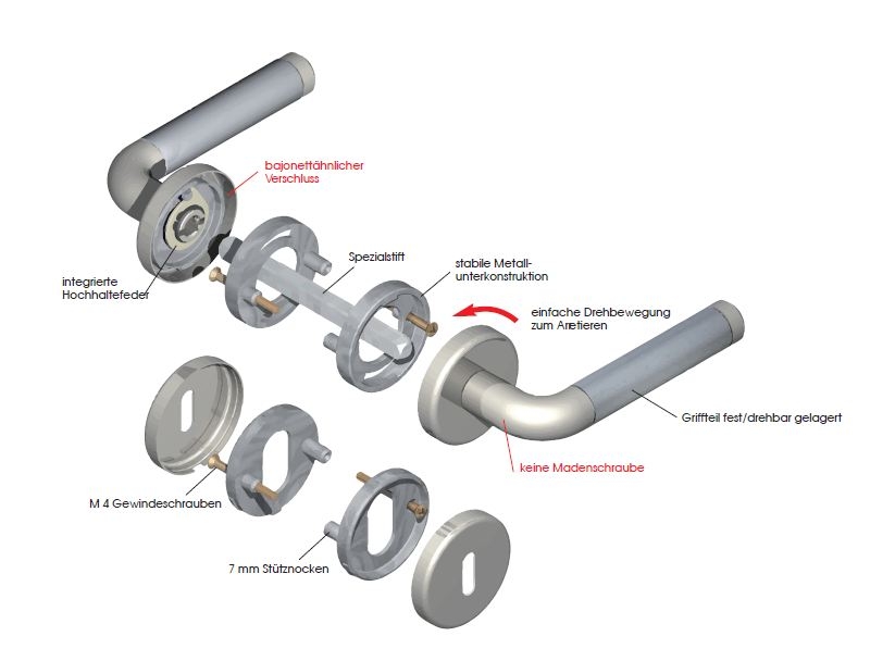 Chromowana i satynowana powierzchnia ze stali szlachetnej przyciąga wzrok w każdym domu. Dzięki metalowej podkonstrukcji (bez sworznia) połączenie klamki i gałki jest ponadto wyjątkowo niezawodne i bezpieczne.