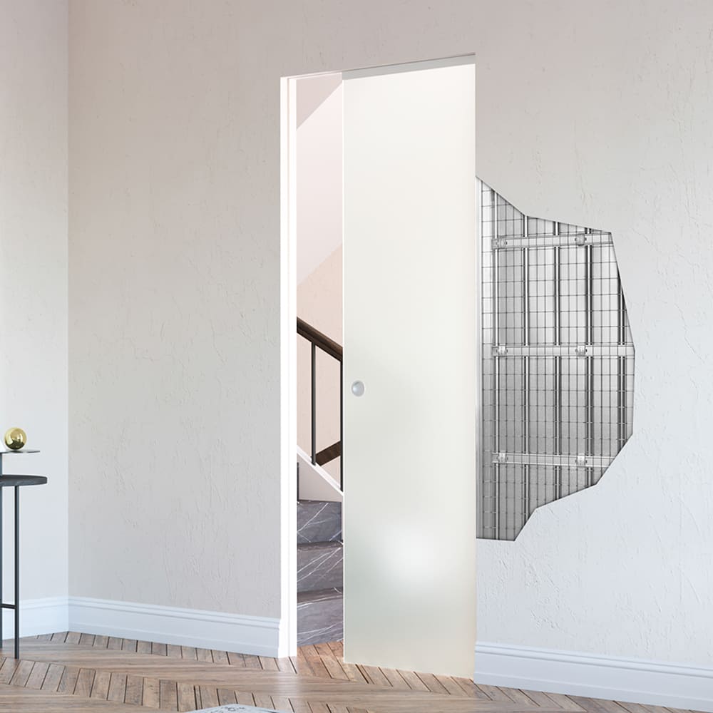 Profilowane wzmocnienia poprzeczne z ocynkowanej blachy stalowej zapewniają wysoką odporność na działanie siły. Dzięki wystającemu nośnikowi tynku system drzwi przesuwnych jest mocno osadzony w murze. System zachwyca optyką na poziomie ściany. System drzwi przesuwnych jest zaprojektowany do montażu w budownictwie masywnym o grubości ściany 150 mm.