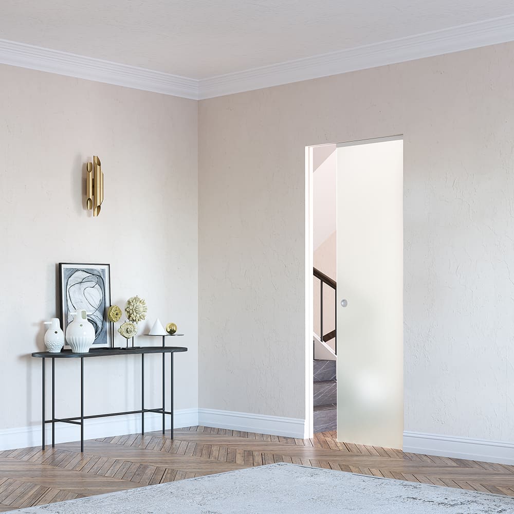 Elegancki design spotyka łatwy montaż: System drzwi przesuwnych Syntesis Line od renomowanego producenta Eclisse nadaje się do montażu jednoskrzydłowych drzwi szklanych.