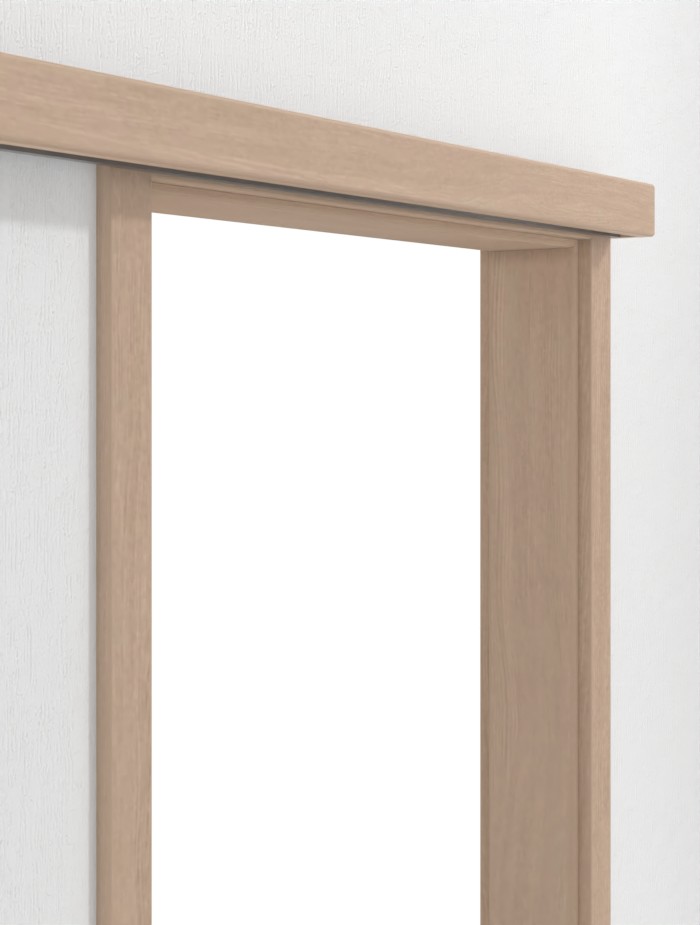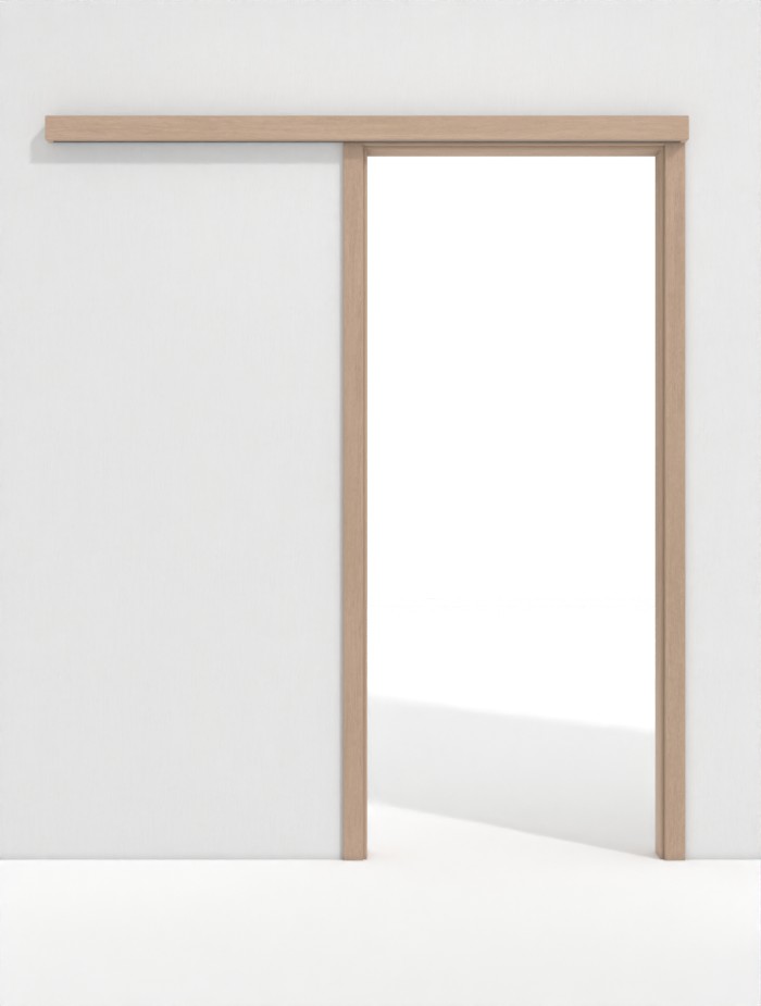 Wytrzymały system drzwi przesuwnych w jasnej sosnie od firmy Westag, przeznaczony do jednoskrzydłowych drzwi przesuwnych, biegnący przed ścianą:
