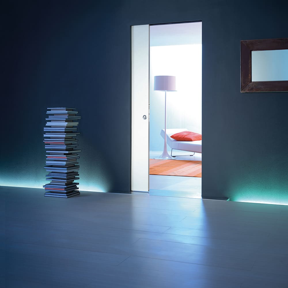 Dzięki optyce licowej, zespół elegancko wkomponowuje się w nowoczesną architekturę wnętrz. Wysoką stabilność zapewniają poprzeczne wzmocnienia z ocynkowanej blachy stalowej. Wewnętrzne kątowniki wzmocnienia można optymalnie wygładzić, co zapobiega pęknięciom w tym obszarze. System drzwi przesuwnych jest zaprojektowany do montażu w budownictwie masywnym z grubością ściany 150 mm.