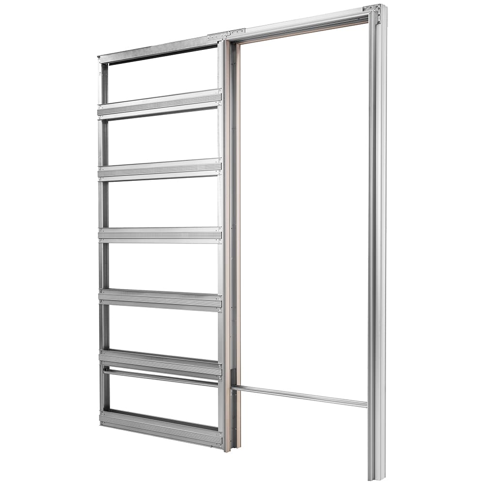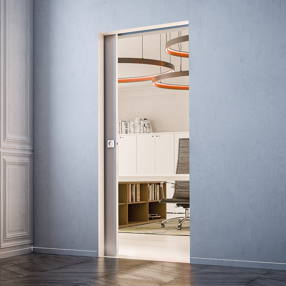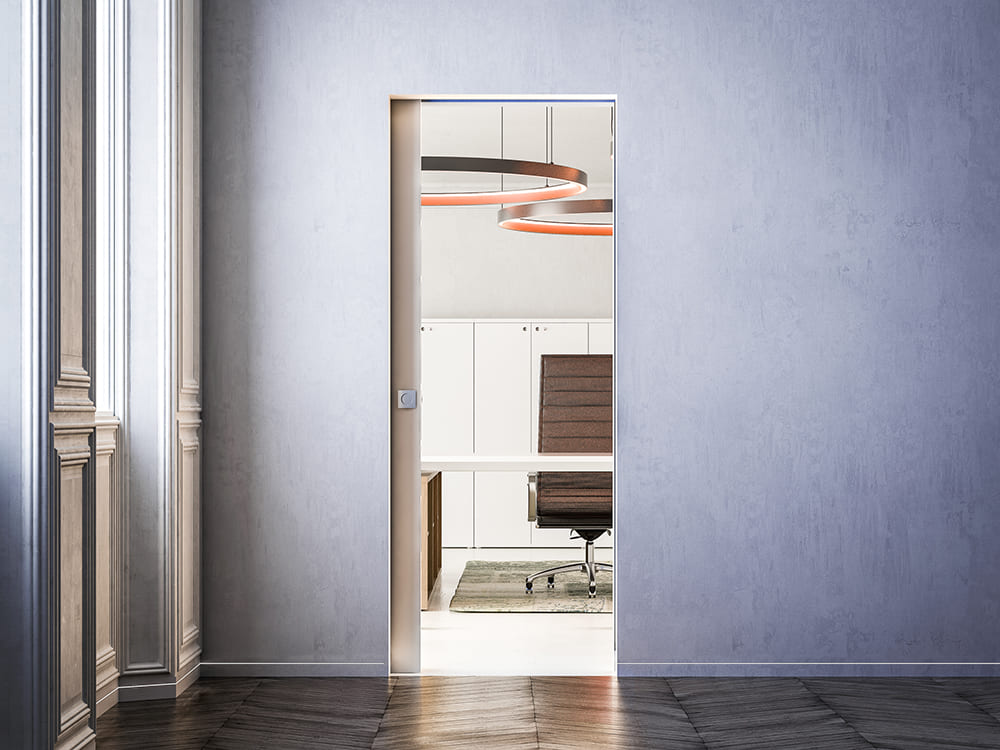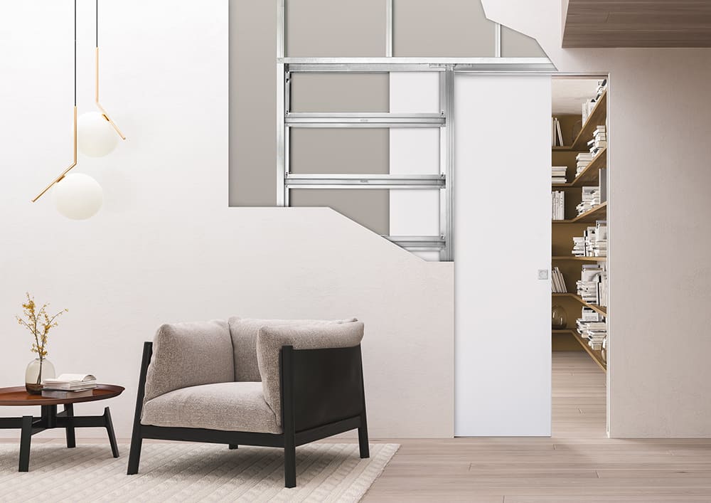 Łatwa montaż i nowoczesny wygląd: Dzięki systemowi drzwi przesuwnych Syntesis Line od Eclisse bezpiecznie zamontujesz jednoskrzydłowe drzwi przesuwne z drewna w zabudowie gipsowej.