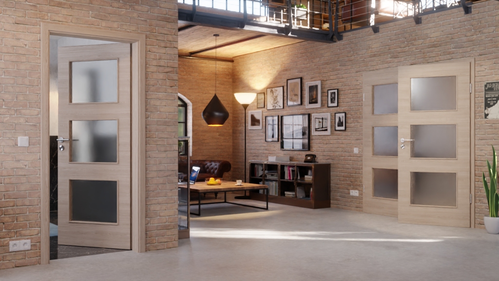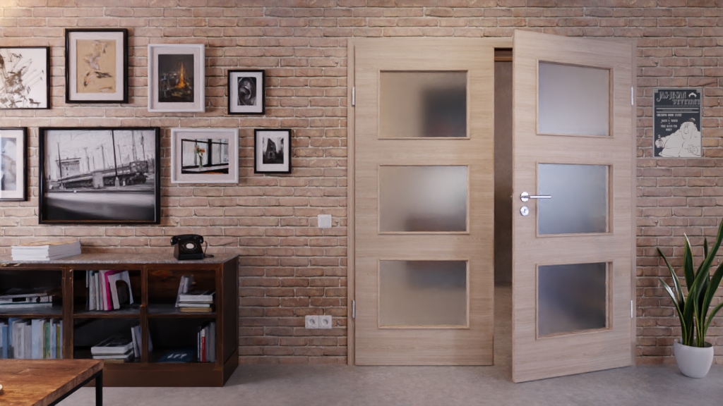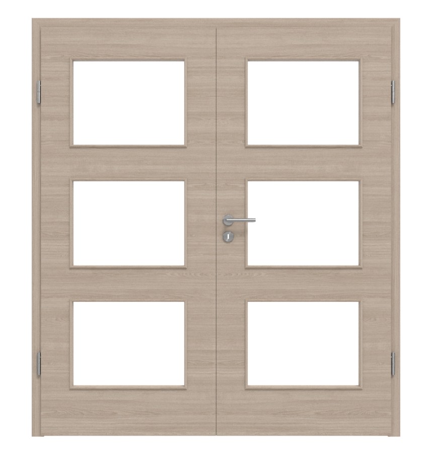 Trzy prostokątne okna świetlne rozciągają się niemal na całej powierzchni każdego skrzydła drzwi podwójnych. Dzięki temu do wnętrza wpada dużo światła, co przyczynia się do harmonijnej atmosfery.