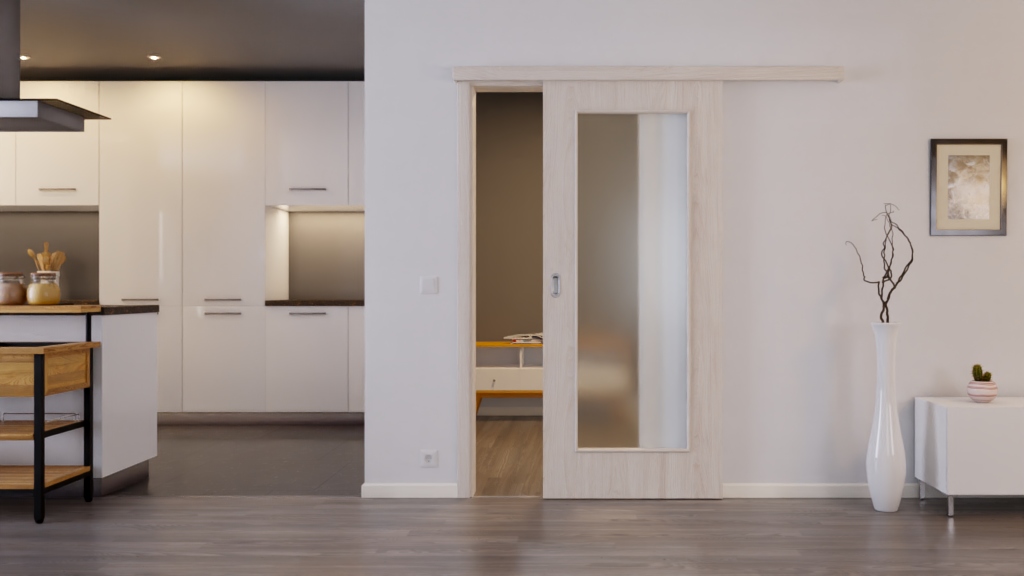 Robustne drzwi przesuwne ProLine w szczotkowanej soli dębowej z pełną płytą wiórową, która zapewnia stabilność: