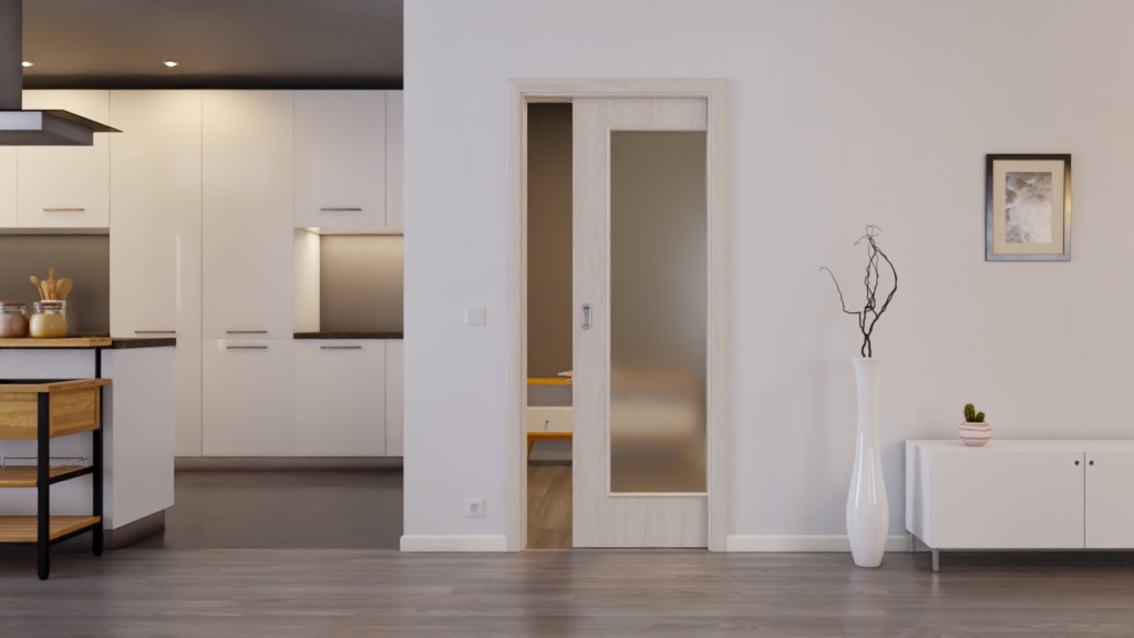 Szklany panel zajmuje niemal całą powierzchnię skrzydła drzwi. W ten sposób zapewnia ogromny dopływ światła i tworzy w ten sposób przepełnione światłem pomieszczenie.