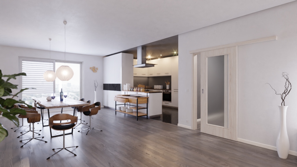 Inteligentne rozwiązanie mieszkaniowe: Drzwi przesuwne ProLine LA 8 w kolorze szczotkowanego dębu solnego marki Hörmann zapewniają płynną koncepcję mieszkania.