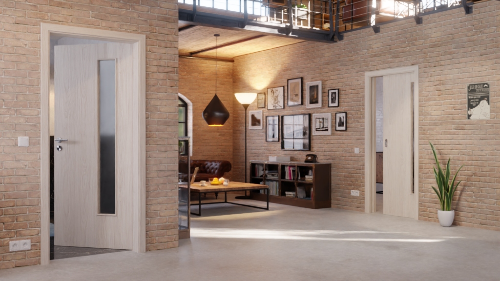 Długi, wąski otwór okienny po stronie zawiasów skrzydła drzwiowego wpuszcza do pomieszczenia nieco światła. Ponadto stanowi on atrakcyjny element, który w przyjemny sposób ożywia ogólny wygląd.