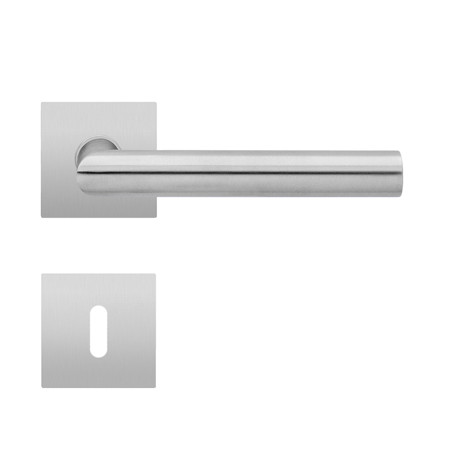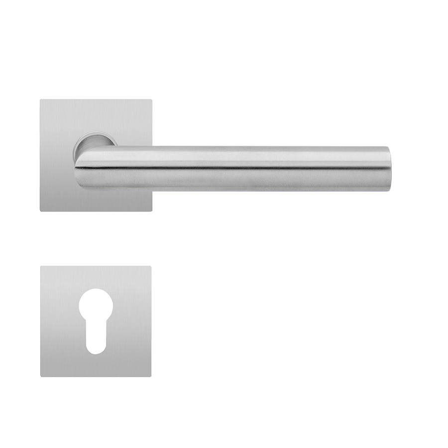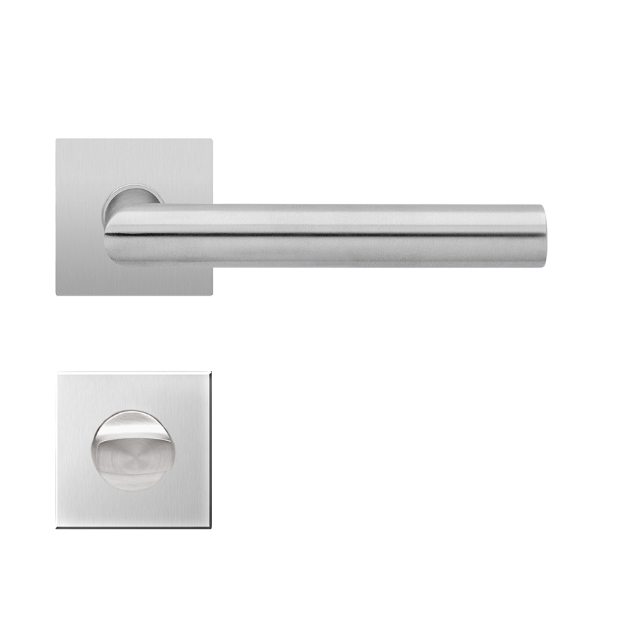 Model z nierdzewnej stali z prostokątnie wygiętą klamką jest szczotkowany i elegancki w designie. Kwadratowa rozeta jest niewidocznie przykręcana, co sprawia, że wygląda szczególnie subtelnie, co dodatkowo podkreśla jej płaska struktura.