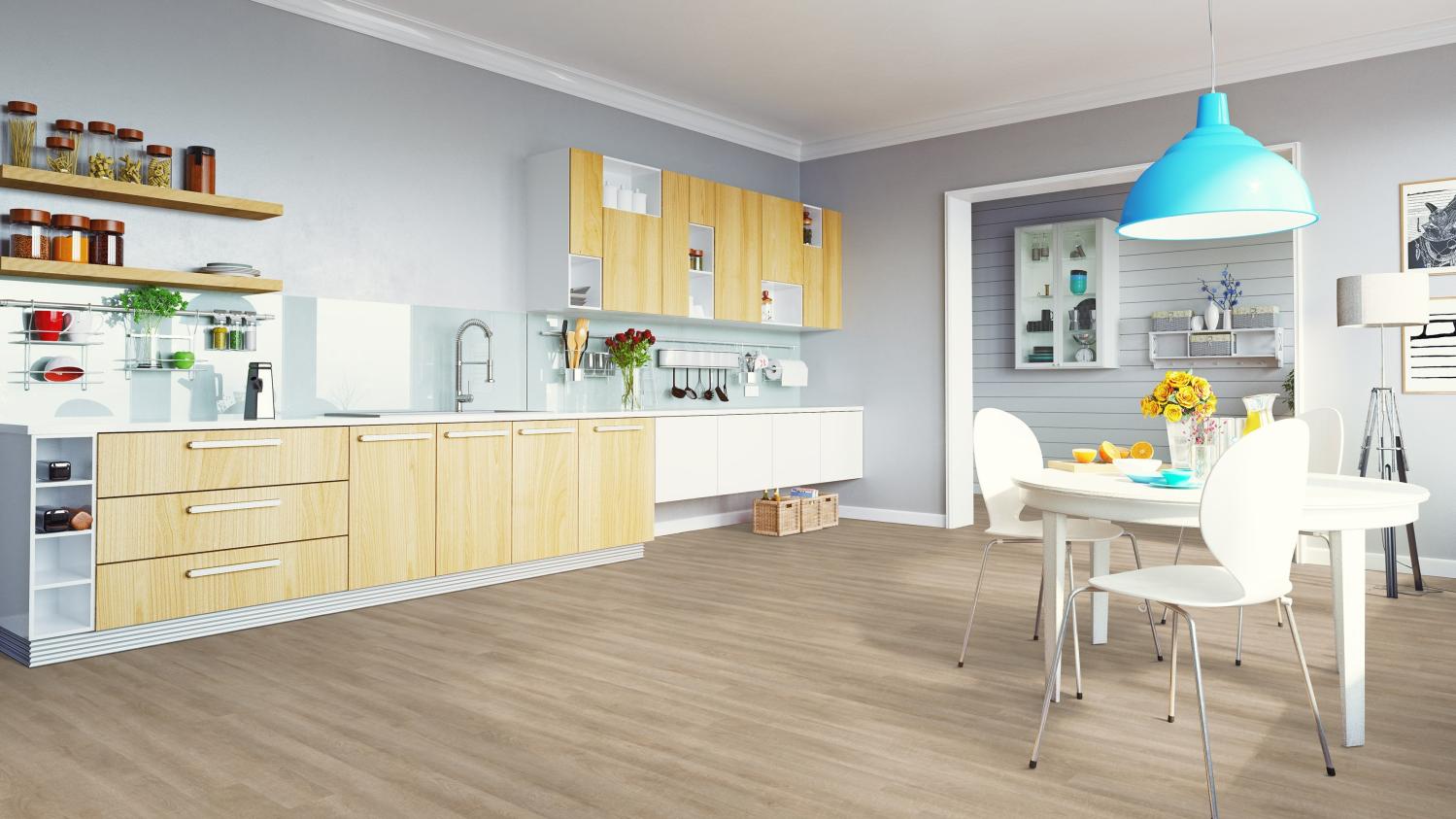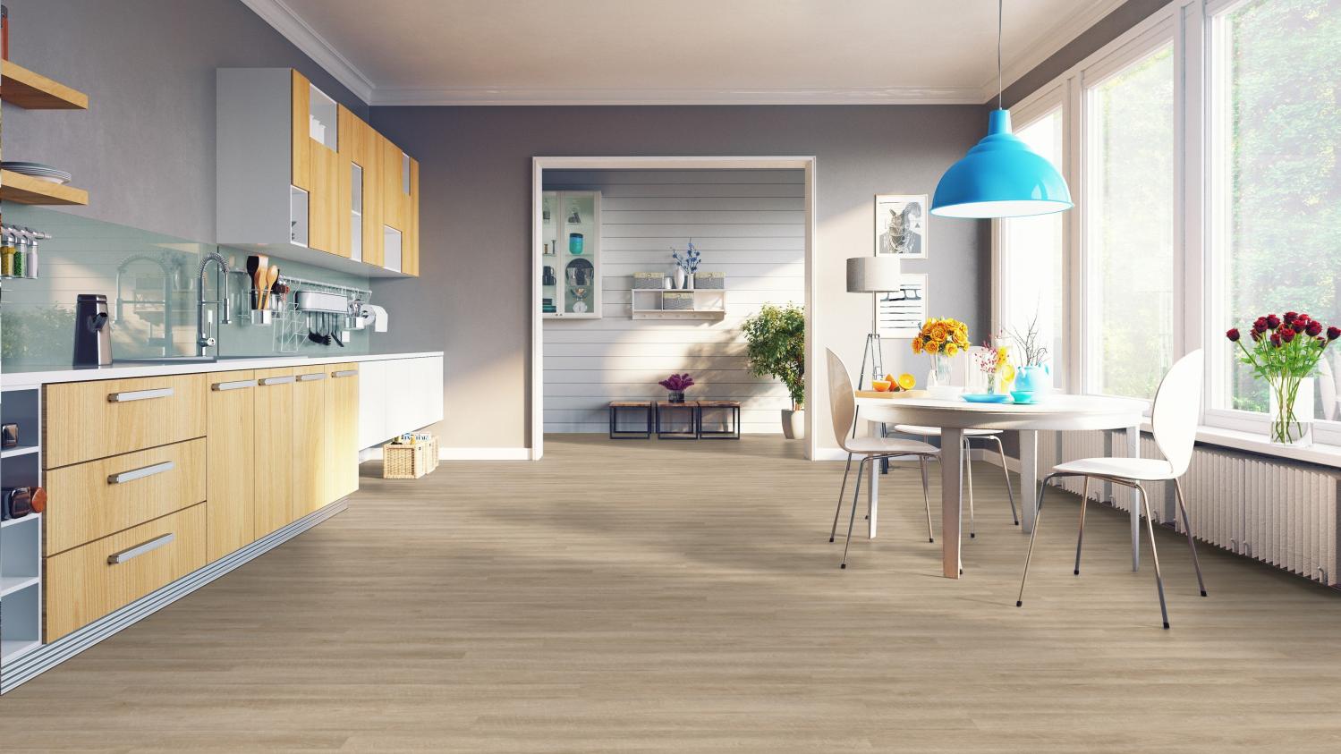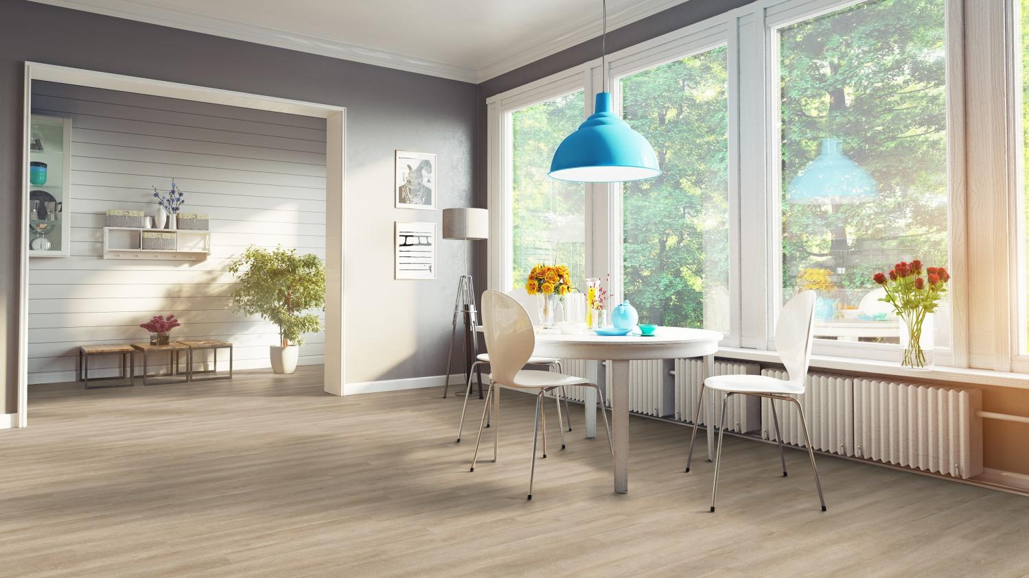 Nowoczesna podłoga do Twoich pomieszczeń mieszkalnych: Podłoga dekoracyjna w kolorze antycznego dębu beżowego z kolekcji Inspiration 70 firmy Tarkett wprowadza naturalną atmosferę do Twojego domu.