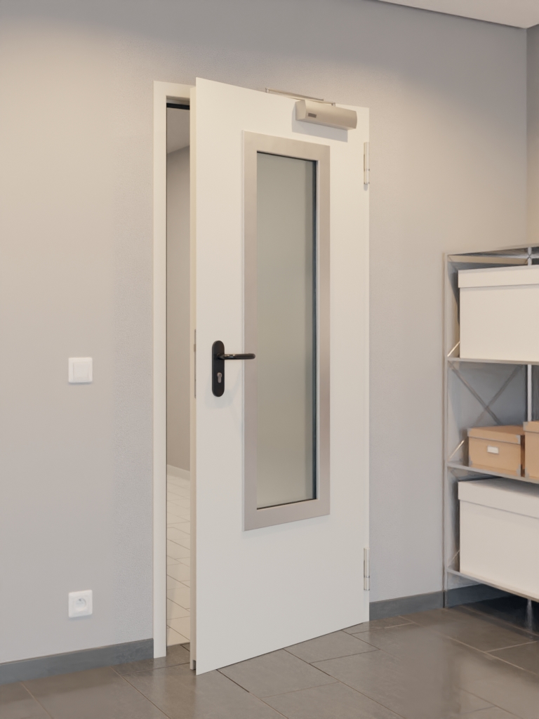 Zestaw drzwi przeciwpożarowych z prostokątnym przeszkleniem i narożną ościeżnicą: