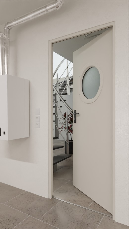 Model ten, przetestowany zgodnie z normą DIN 4102, zapewnia 90 minut ochrony przed płomieniami i wysoką temperaturą. W skład zestawu do drzwi wewnętrznych wchodzi, oprócz skrzydła o grubości 62 mm i ościeżnicy narożnej, plastikowa klamka okrągła z certyfikatem przeciwpożarowym , dwa zawiasy z łożyskami kulkowymi oraz samozamykacz górny.
