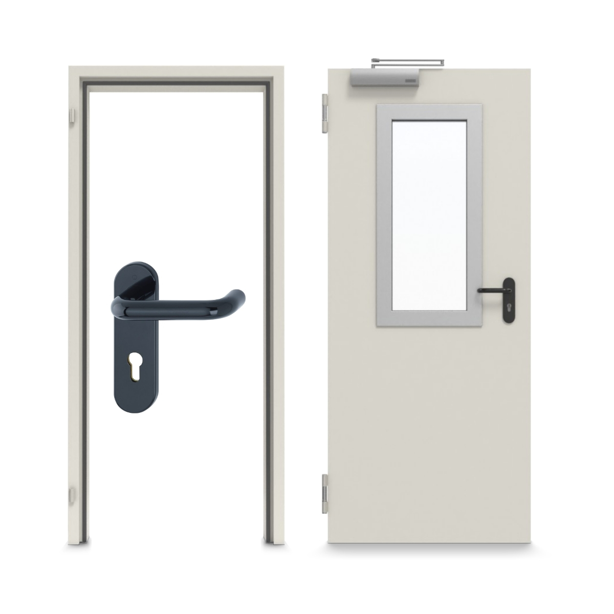 W przypadku pożaru model ten, przetestowany zgodnie z normą DIN 4102, wytrzymuje działanie ognia i płomieni przez 90 minut. W zestawie znajduje się narożna ościeżnica, okrągła klamka przeciwpożarowa z tworzywa sztucznego, dwa zawiasy z łożyskami kulkowymi oraz samozamykacz górny.