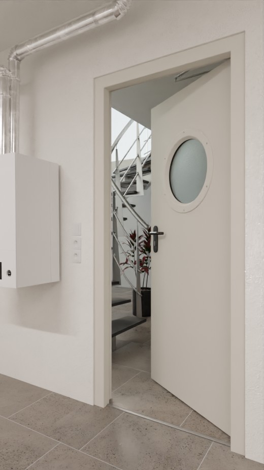Stabilną powierzchnię gwarantuje połączenie powłoki proszkowej i podkładu w kolorze szaro-białym, które są nakładane na stalowe skrzydło drzwiowe. Zaokrąglone przeszklenie wykonane ze szkła przeciwpożarowego nadaje pomieszczeniu otwarty charakter w stylu marynistycznym.
