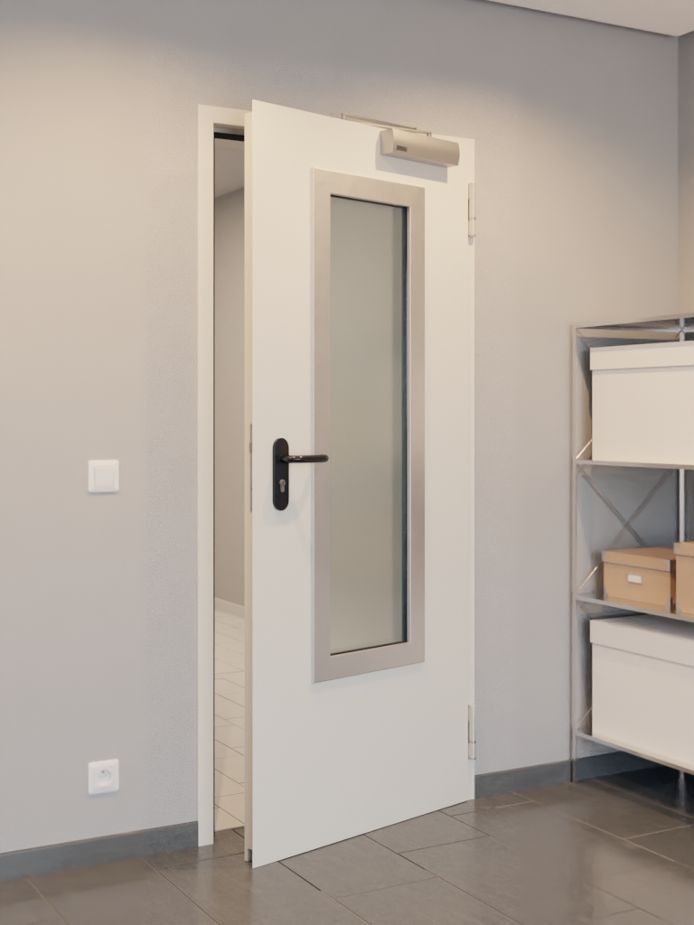 Prostokątny wycięty fragment w skrzydle drzwiowym wykonany jest ze szkła przeciwpożarowego. Powściągliwe połączenie przezroczystego designu i szaro-białej powierzchni pasuje do każdego wystroju wnętrza.