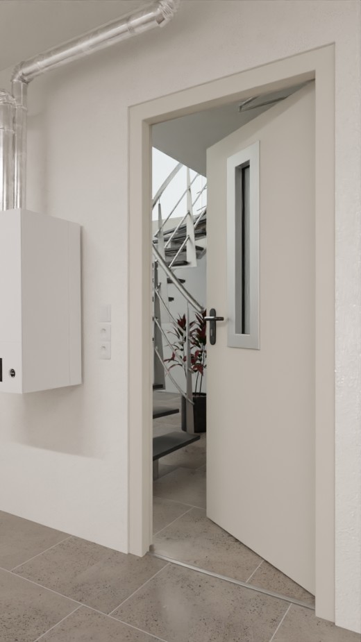 Ochrona przeciwpożarowa została sprawdzona zgodnie z normą DIN 4102. W przypadku pożaru model chroni przed płomieniami i wysoką temperaturą przez 90 minut . Oprócz skrzydła drzwiowego o grubości 62 mm i ościeżnicy blokowej w zestawie znajduje się okrągła klamka ochronna przeciwpożarowa z tworzywa sztucznego, dwa zawiasy z łożyskami kulkowymi oraz samozamykacz drzwiowy górny.