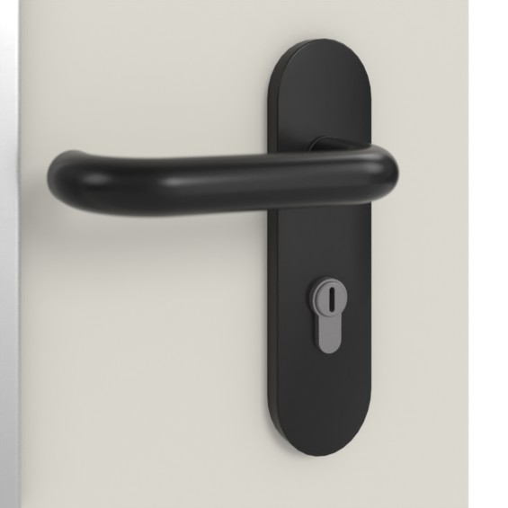 Czarny komplet klamek z tworzywa sztucznego ECO Form D 110 z krótką tarczą dopełnia kompletny zestaw: