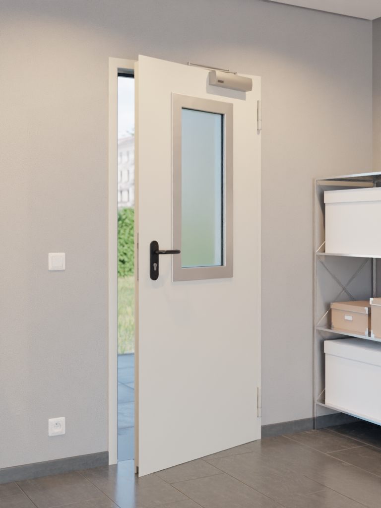 Zarówno rama, jak i skrzydło drzwiowe są ocynkowane i pokryte podkładem w kolorze szaro-białym. Prostokątny wycięty fragment ze szkła przeciwpożarowego nadaje modelowi indywidualny charakter i zapewnia doświetlenie strefy wejściowej.