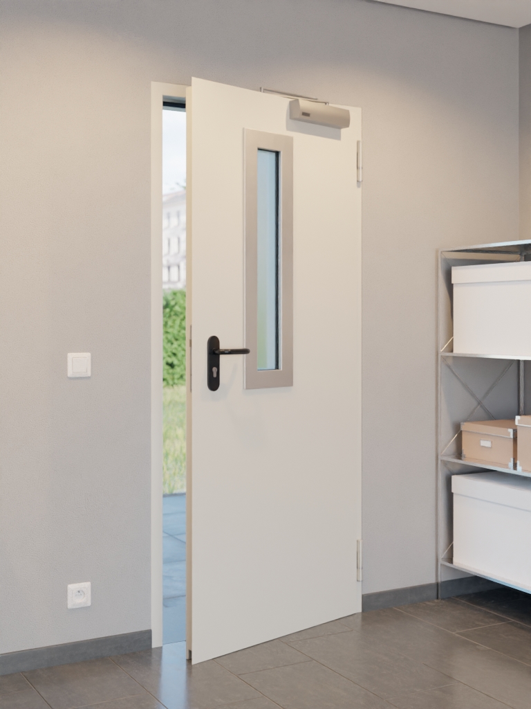 Na skrzydle i ościeżnicy, które są ocynkowane, zastosowano szaro-białą farbę podkładową o barwie zbliżonej do RAL 9002. Dzięki obróbce powierzchni model jest odporny na korozję i oddziaływaniamechaniczne. Prostokątne przeszklenie wykonane jest ze szkła przeciwpożarowego.