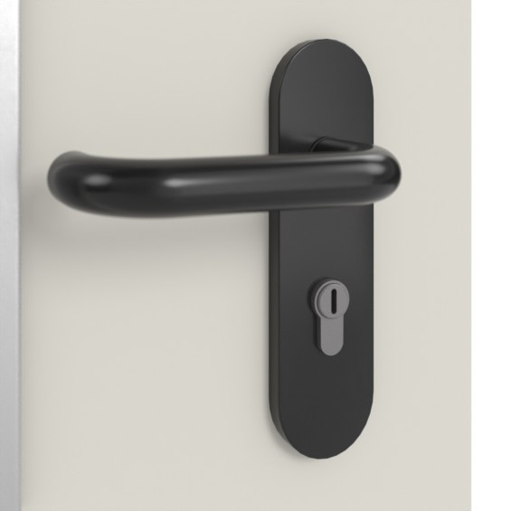 Czarna klamka z tworzywa sztucznego ECO Form D 110 z krótką tarczą dopełnia kompletny zestaw: