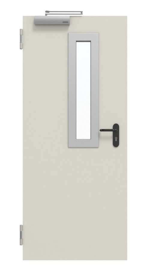Skrzydło drzwiowe i ościeżnica, które dzięki cynkowaniu są odporne na korozję, zostały wykonane z szaro-białym podkładem. Chronią powierzchnię przed oddziaływaniem czynników mechanicznych. Na skrzydle drzwiowym znajduje się prostokątne przeszklenie wykonane ze szkła przeciwpożarowego.