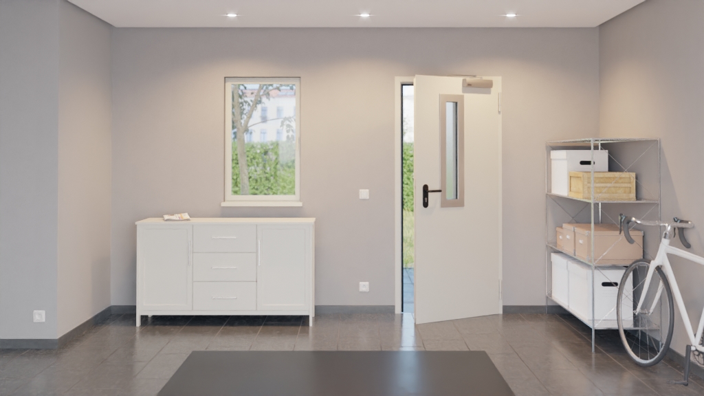 Model przeciwpożarowy, przetestowany zgodnie z normą EN 16034 , chroni przed płomieniami i wysoką temperaturą przez co najmniej 30 minut. Ponieważ drzwi zewnętrzne wyposażone są w opuszczaną uszczelkę podłogową, do przedpokoju nie dostaje się ani wiatr, ani deszcz. Zestaw drzwi zewnętrznych zawiera ościeżnicę narożną, dwa zawiasy konstrukcyjne, samozamykacz drzwiowy górny, zamek wpuszczany oraz czarną klamkę okrągłą.