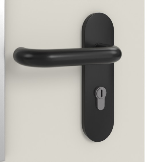 Czarny komplet klamek z tworzywa sztucznego ECO Form D 110 z krótką tarczą dopełnia kompletny zestaw: