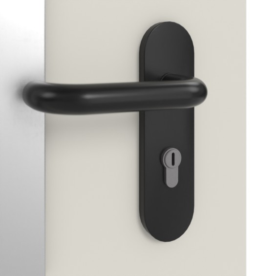 Czarny komplet klamek z tworzywa sztucznego ECO Form D 110 z krótkim szyldem dopełnia kompletny zestaw: