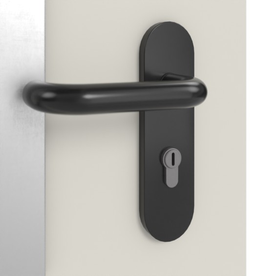 Czarna klamka z tworzywa sztucznego ECO Form D 110 z krótkim szyldem uzupełnia kompletny zestaw: