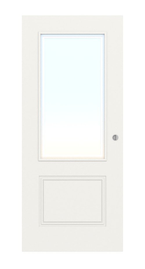 Na wysokości oczu umieszczono fragment przeszklenia ESG. W cenie zawarte jest szkło satynowane wraz z odświeżającą aplikacją. Białe wykończenie nadaje skrzydłu drzwiowemu prosty i elegancki wygląd.