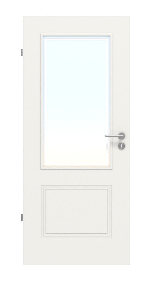 Białe lakierowanie nadaje skrzydłu drzwiowemu wspaniały połysk. Dzięki otworowi świetlnemu do pomieszczeń wpada dużo światła. W cenie zawarty jest rodzaj szkła satynowane wraz z odświeżającą aplikacją.