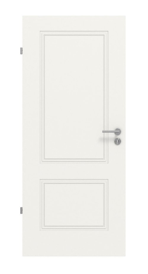 Wytłoczone linie tworzą klasyczny wzór kasetowy na skrzydle drzwiowym. Białe wykończenie nadaje mu nowoczesny wygląd.