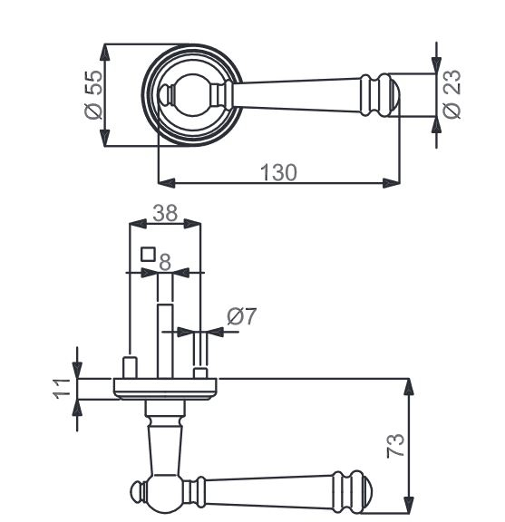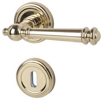 Model zawdzięcza swój wspaniały wygląd przede wszystkim polerowanejpowierzchni z mosiądzu. Zabawne detale i frezowania na klamce nadają jej historyczny wygląd. Również okrągłe rozety są ozdobione pięknymi rowkami.