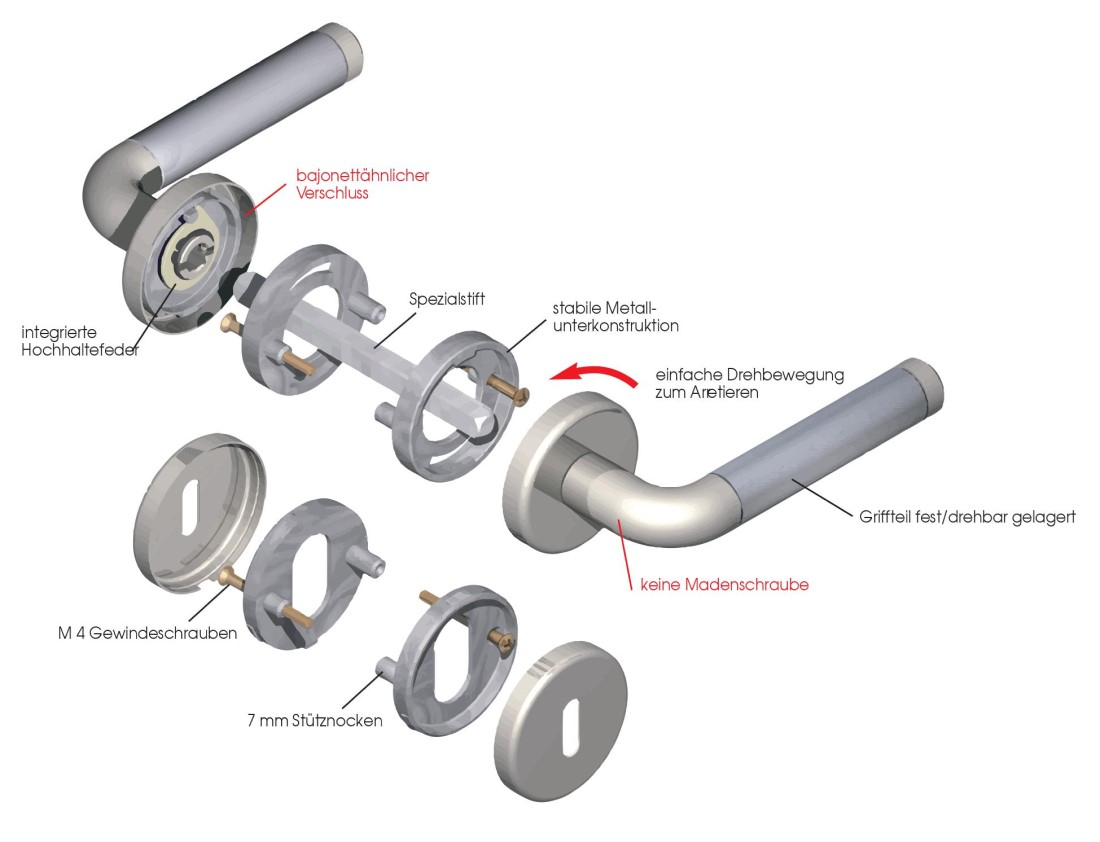 Rozeta skrywa trzpień wbijany i śruby gwintowane, które zapewniają stabilną blokadę. Dzięki swojej wyjątkowej strukturze zapewnia ona delikatną obróbkę powierzchniową skrzydła drzwiowego podczas montażu klamki.