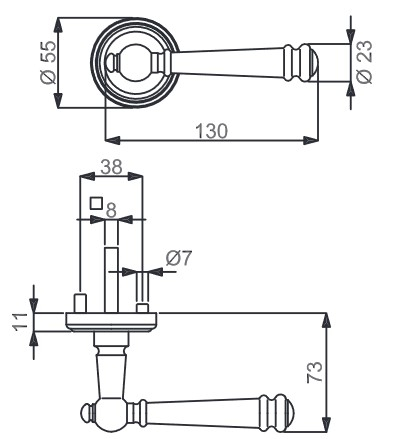 Stożkowa klamka dobrze leży w dłoni. Bogate w detale akcenty wzdłuż uchwytu przywołują wspomnienia dawnych czasów. Obie okrągłe rozety charakteryzują się głębokimi żłobieniami.