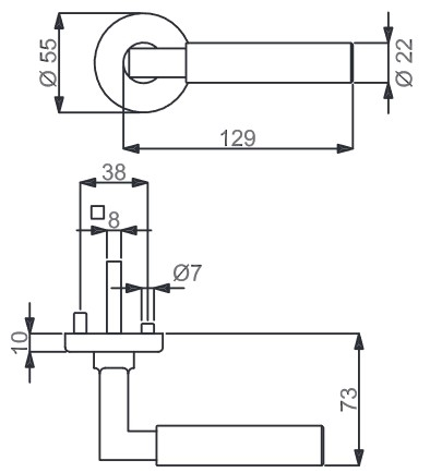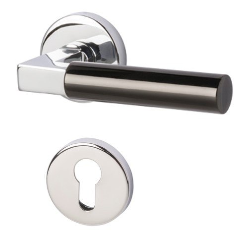 Cylindryczny uchwyt jest wygodny i kończy się w kształcie sześcianu przy rosetcie. Obie okrągłe rosety otoczone są błyszczącym chromem i można je delikatnie zamontować na skrzydle drzwi.