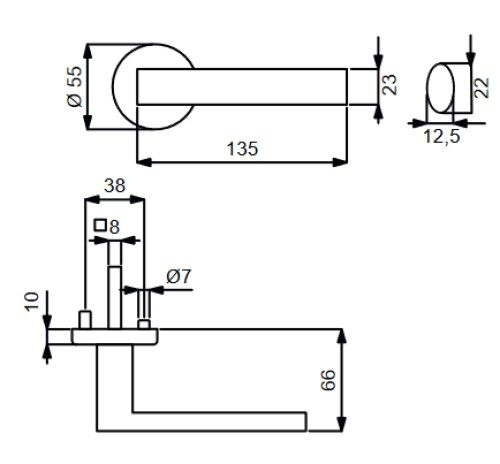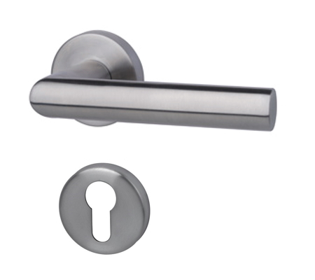 Model w matowym stalowym wykończeniu składa się z okrągłych rozet i prostego uchwytu w kształcie cylindra. Dzięki zintegrowanej sprężynie podtrzymującej zapewniony jest trwały poziomy montaż klamki.