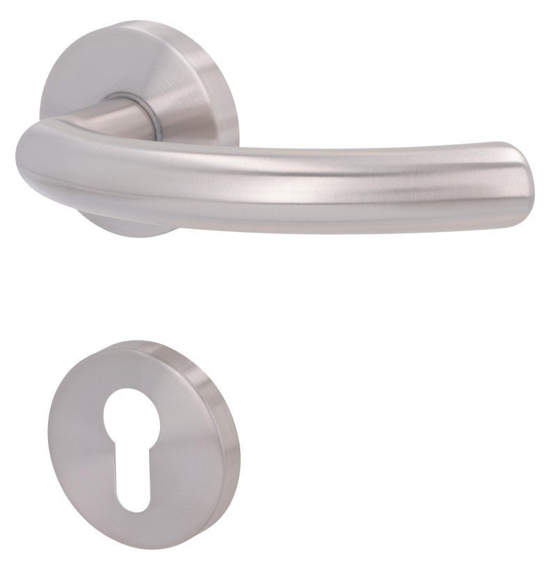 Zestaw ma satynowe wykończenie ze stali nierdzewnej. Klamka ma półokrągły kształt, który kończy się ostrą krawędzią na górnej rosetcie. Obie rosety można delikatnie zamocować na skrzydle drzwiowym.