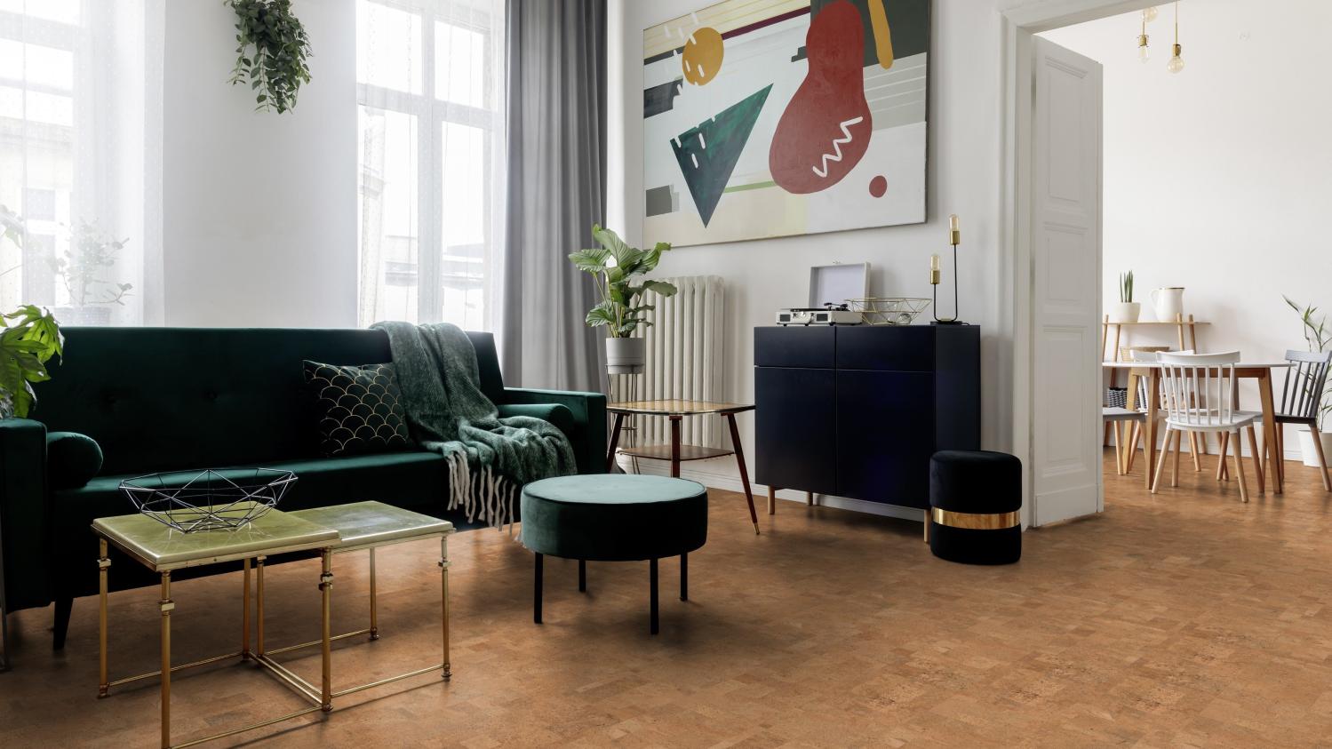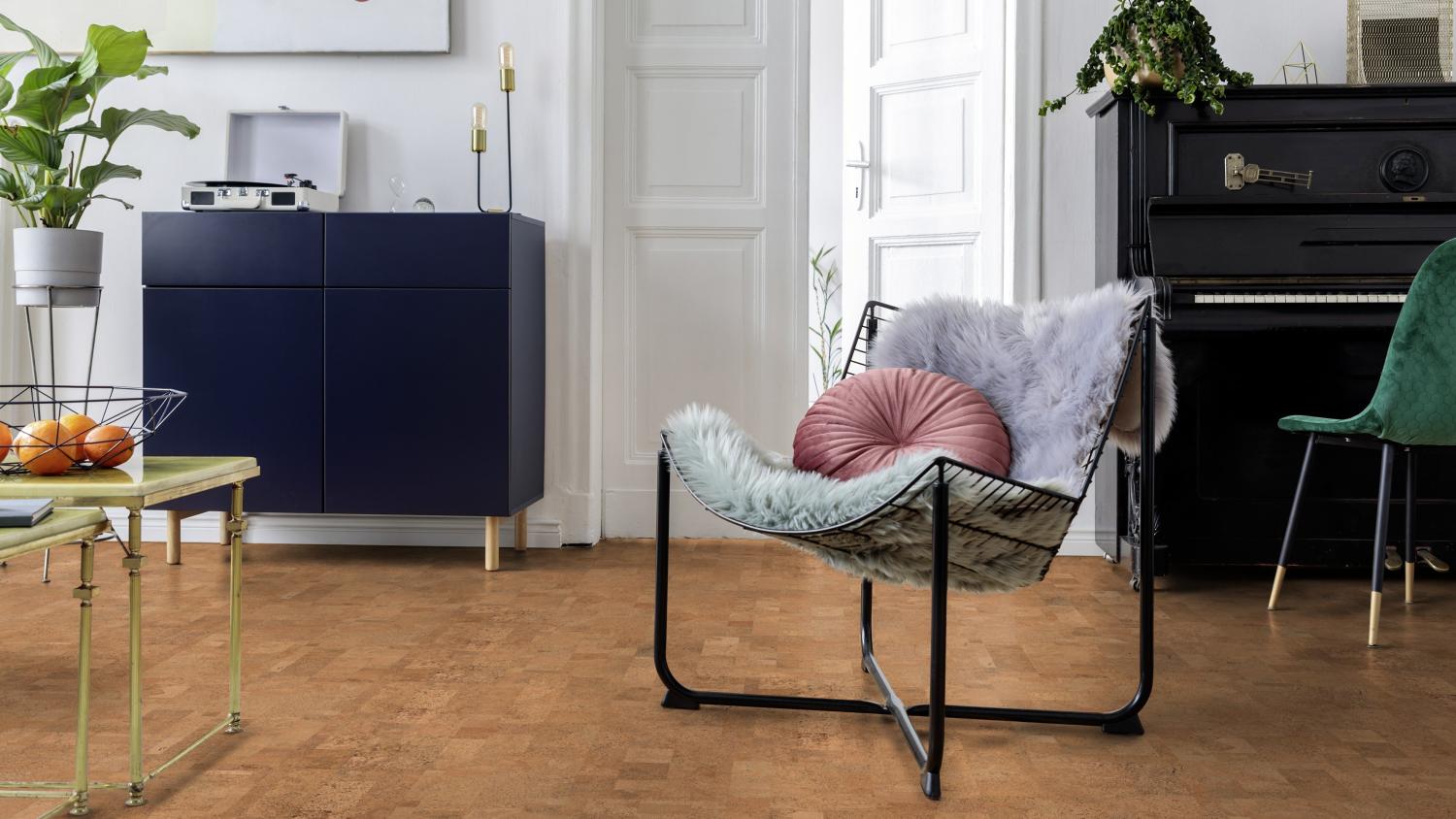 Naturalne mieszkanie z komfortem: Podłoga korkowa Identity Natural w kolorze brązowym z serii Cork Pure firmy Wicanders zapewnia komfort i wprowadza naturalność do Twojego domu.