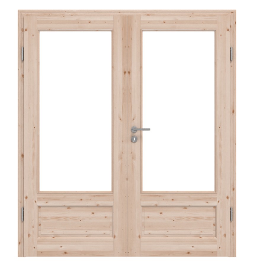 W górnej części skrzydeł drzwiowych znajdują się duże przeszklenia, które wpuszczają światło do Twojego pomieszczenia. Poniżej znajduje się prostokątna wypełnienie. Ponadto drzwi mają profilowane fryzy, które znacząco przyczyniają się do wiejskiego charakteru. Nieobrobiona powierzchnia idealnie nadaje się do nadania drzwiom pożądanego wyglądu za pomocą preferowanego lakieru. Twojej wyobraźni nie ma granic. Możesz również zdecydować się na bezbarwny lakier. To szczególnie podkreśla usłojenie drewna.