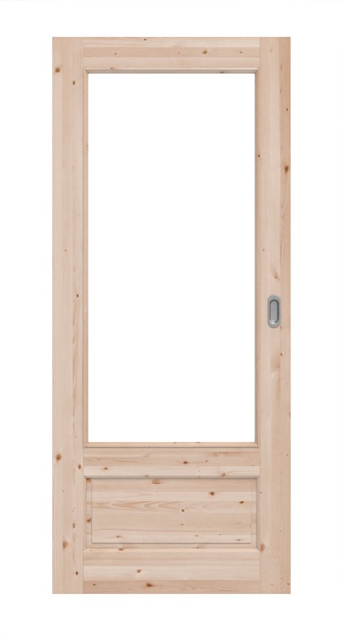 W górnej części skrzydła drzwi znajduje się duże okno świetlne, które wpuszcza światło do Twojego pomieszczenia. Poniżej znajduje się prostokątna wypełnienie. Profilowany fryz drzwiowy nadaje drzwiom przesównym rustykalny design. Powierzchnia drewna jest opcjonalnie nieprzetworzona lub pokryta bezbarwnym lakierem. Surowa powierzchnia ma tę zaletę, że możesz samodzielnie pomalować drzwi. Bezbarwny lakier szczególnie podkreśla usłojenie drewna.