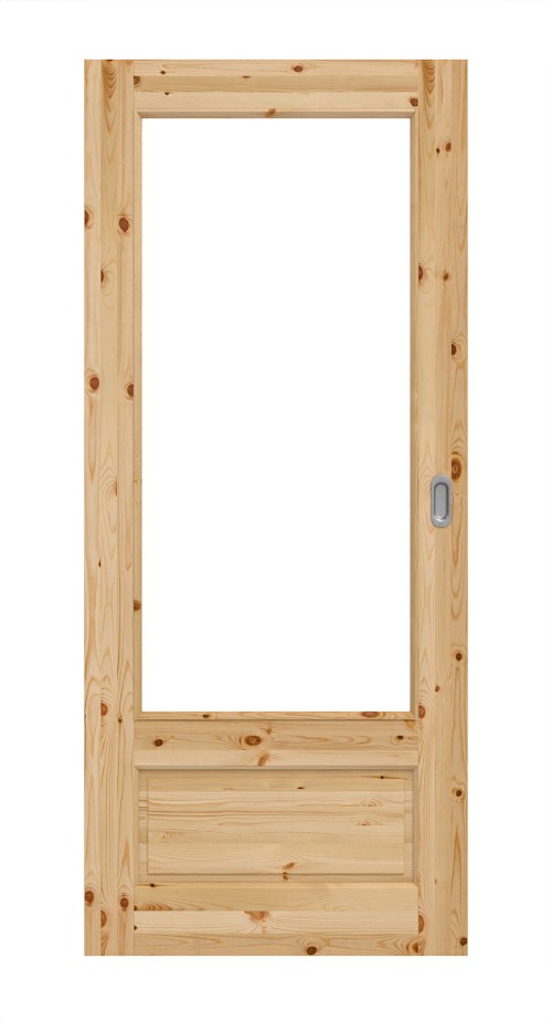 W górnej części skrzydła drzwi znajduje się duże okno świetlne, które wpuszcza światło do Twojego pomieszczenia. Poniżej znajduje się prostokątna wypełnienie. Profilowany fryz drzwiowy nadaje drzwiom przesuwanym rustykalny design. Powierzchnia drewna jest opcjonalnie nieobrobiona lub pokryta bezbarwnym lakierem. Surowa powierzchnia ma tę zaletę, że możesz samodzielnie pomalować drzwi. Bezbarwny lakier szczególnie podkreśla usłojenie drewna.