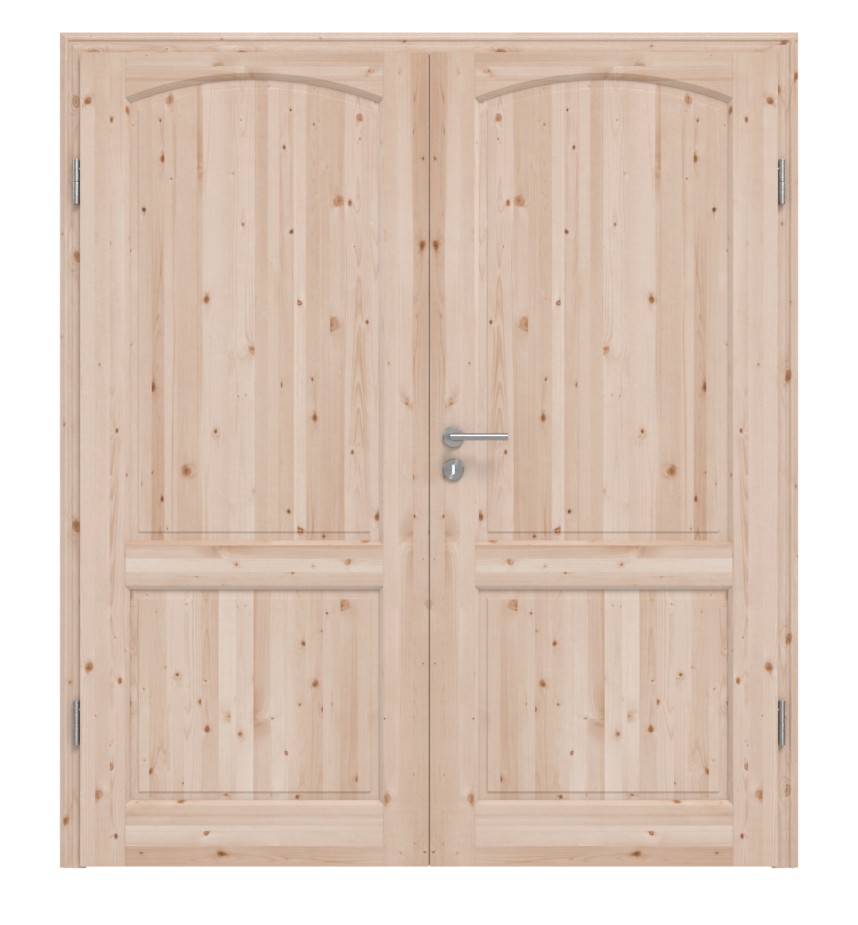 Górna kaseta zajmuje dużą część skrzydła drzwi i ma zaokrąglony łuk na górnym końcu. Wraz z nieco mniejszym wypełnieniem poniżej tworzy tradycyjny ogólny wygląd. Profilowane fryzy drzwiowe nadają podwójnym drzwiom charakterystyczny akcent. Bezbarwne lakierowanie powierzchni drewna sprawia, że drzwi wiejskie wyglądają szczególnie naturalnie i ciepło. Alternatywnie dostępna jest również surowa powierzchnia. Możesz samodzielnie zaprojektować swój indywidualny wygląd poprzez własne lakierowanie.