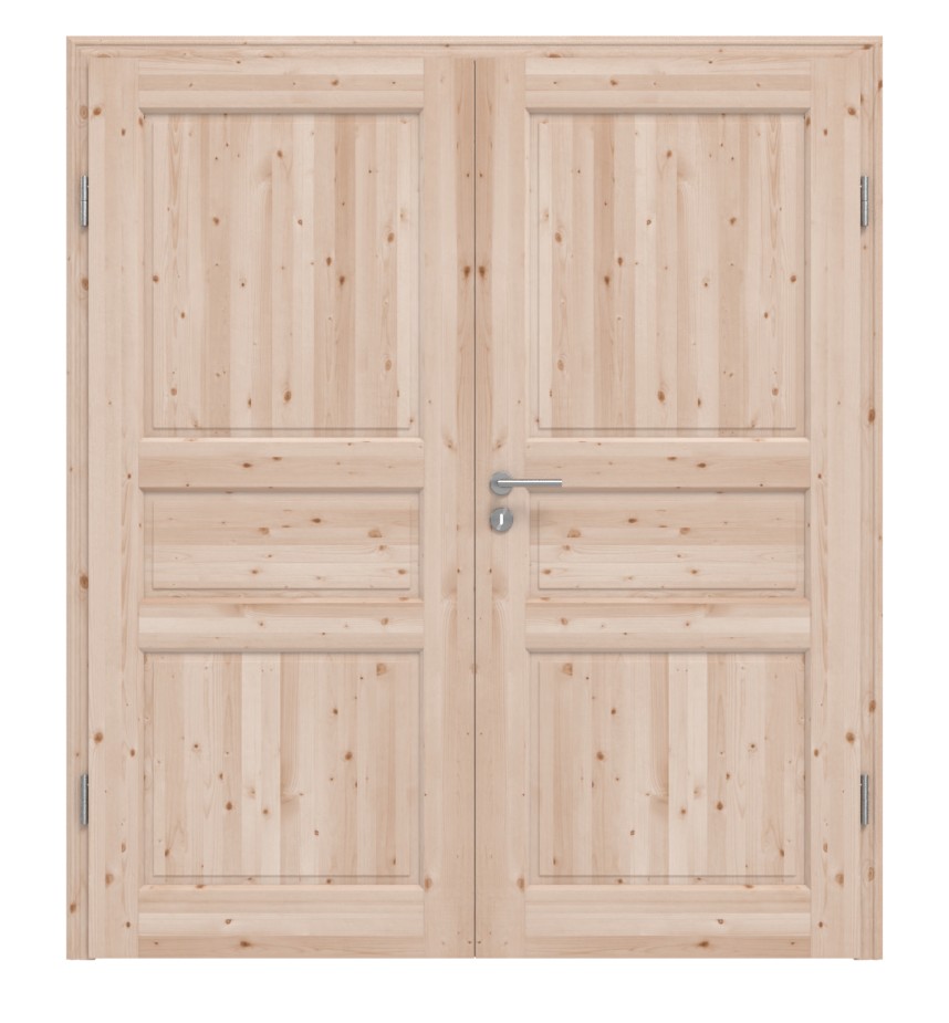 Skrzydła drzwi dzielą się na trzy różnej wielkości kasetony, co zapewnia interesujący ogólny efekt. Nuda przy tych drzwiach podwójnych z pewnością nie wystąpi. Profilowane fryzy drzwiowe nadają podwójnym drzwiom wiejsko-rustykalny charakter. Szczególnie naturalny wygląd zapewnia bezbarwne lakierowanie, które nadaje powierzchni jedwabisty blask. Możesz również zdecydować się na nieprzetworzoną powłokę. Dzięki temu powierzchnię można dostosować do własnych potrzeb w domu.